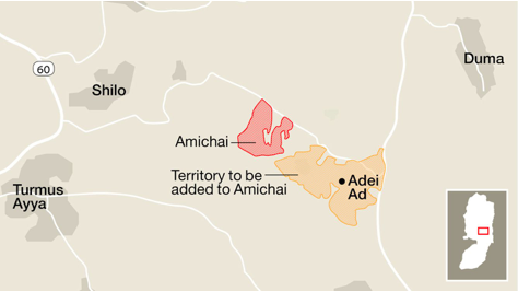 On August 8th, the Israeli Civil Administration announced that it is planning to retroactively legalize the Adei Ad outpost by massively expanding the borders of the (brand new) Amichai settlement to turn Adei Ad into a (non-contiguous) neighborhood of Amichai. In effect, this is a stealth operation by Israel to turn the Adei Ad outpost into an entirely new official, legal settlement.