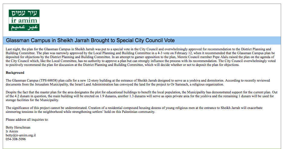Ir Amim reports that plans for a 6-story Israeli commercial building at the entrance of the Palestinian East Jerusalem neighborhood of Sheikh Jarrah have been recommended for deposit for public review. The land designated for this project is adjacent to a plot designated for settlers to build a religious school and dormitories, known as the Glassman Campus project.
