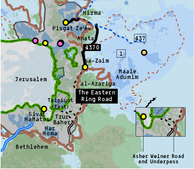 Ir Amim notes that this is one of several projects that prepares the way for building in the E-1 area. E-1, as Jerusalem expert Danny Seidemann has long explained, is a “doomsday” project; if implemented, an E-1 settlement will end the possibility of a contiguous Palestinian state and completely sever East Jerusalem from the rest of the West Bank. The “Eastern Ring Road” seeks to “solve” one of these problems – by providing the Palestinians with “transportational contiguity” between the northern and southern West Bank – even as it would cement the cutting off of East Jerusalem from the West Bank.