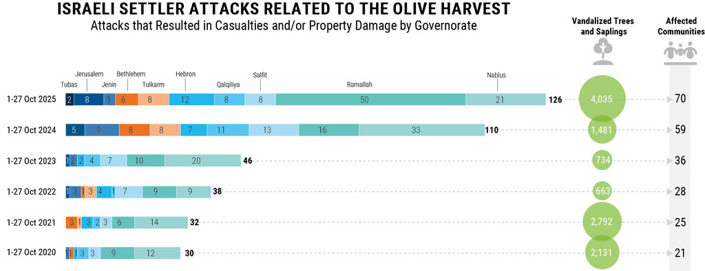 Settlers have continued to terrorize Palestinians harvesting olives during the 2025 harvest season, with virtually no recourse or accountability. Over the course of October, OCHA recorded the highest monthly number of Israeli settler attacks since OCHA began documenting such incidents in 2006, documented 260 attacks – an average of 8 per day. In addition Palestinians continue to suffer from increasingly restrictive Israeli policies that limit access to agricultural land located near settlements and/or the Separation Barrier. Adding to the heightened settler violence, the Israeli government has undertaken a deportation campaign against international solidarity activists who, for years, have accompanied Palestinians during harvest season as a protective presence.