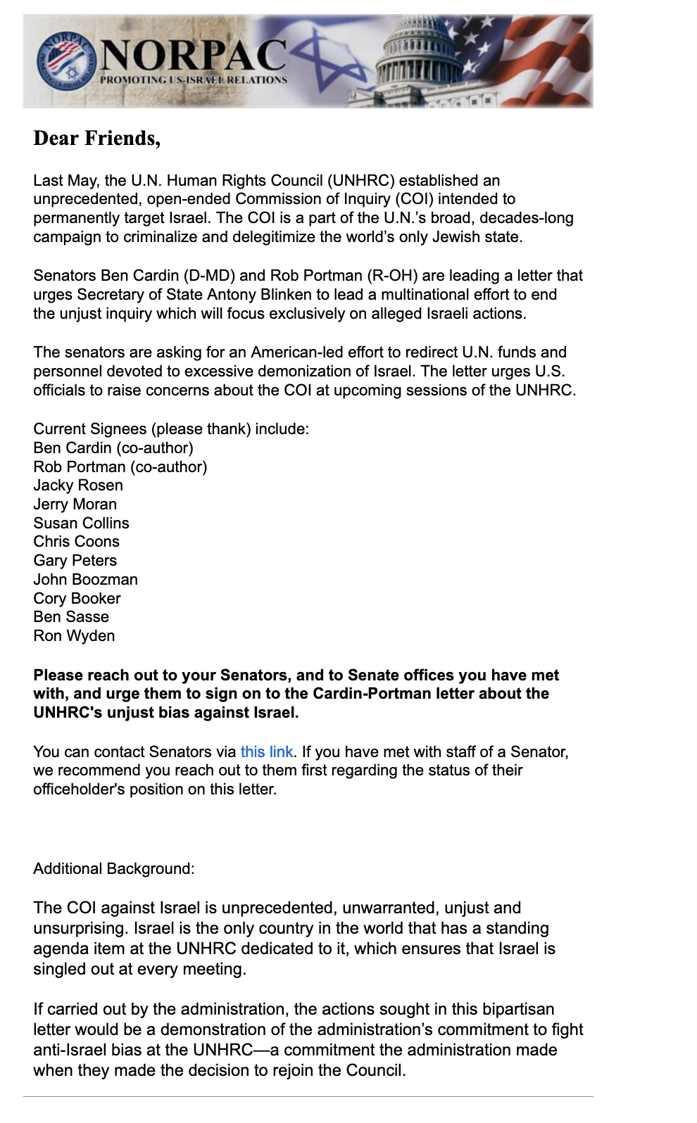 UPDATE — (DELEGITIMIZE & SHUT DOWN UNHRC INQUIRY ON ISRAEL!!) AIPAC/Senate letter to Blinken: See last week’s Round-Up for details of this letter. Notably this week, the letter is being lobbied aggressively by AIPAC (e.g., here and here) and is also being lobbied by NORPAC.