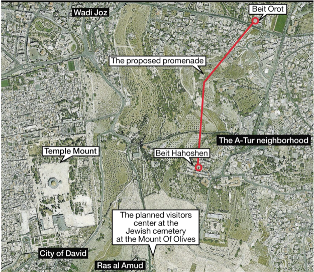 Two of the plans relate to the proposal for a new promenade connecting two settlement enclaves (Beit Orot and Beith Hahoshen) located inside the Palestinian neighborhood of A-Tur, the construction of which will require the expropriation of private Palestinian land.